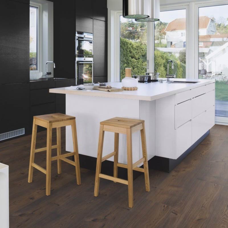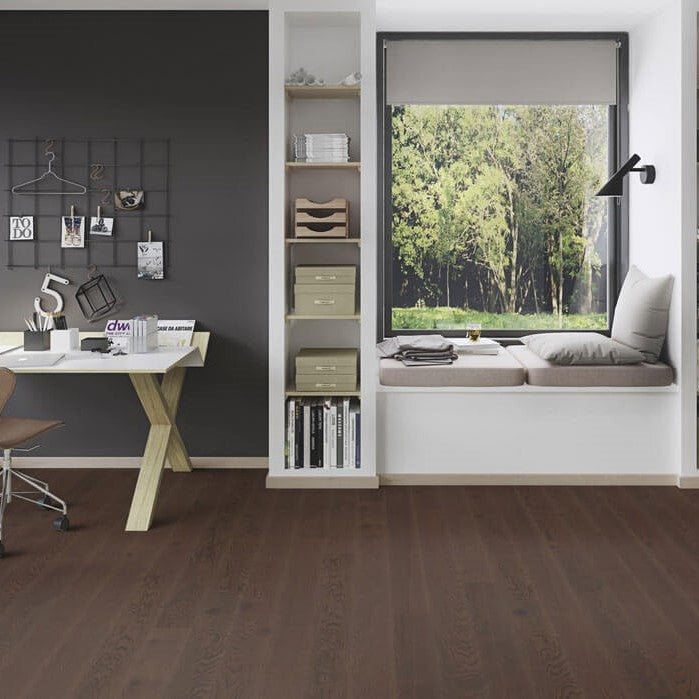 Kahrs Harmony Oak Lava: Kahrs Oak Lava is a sophisticated engineered wood flooring option with a deep, rich brown hue and a matte finish. The brushed surface accentuates the natural grain and texture, giving it a warm and inviting look. Its durable construction ensures stability and longevity, ideal for various interior styles. The convenient click-lock system allows for easy installation, making it a practical and elegant choice for any space.