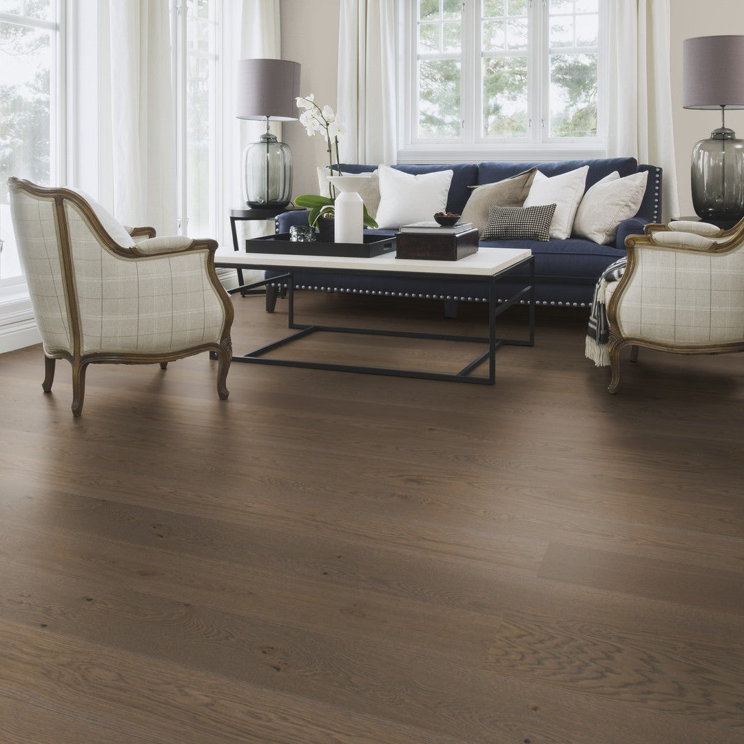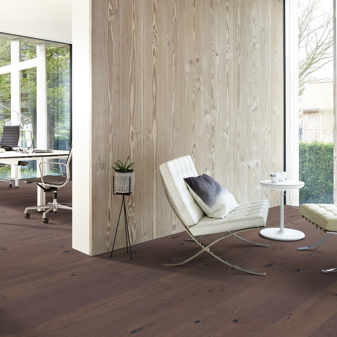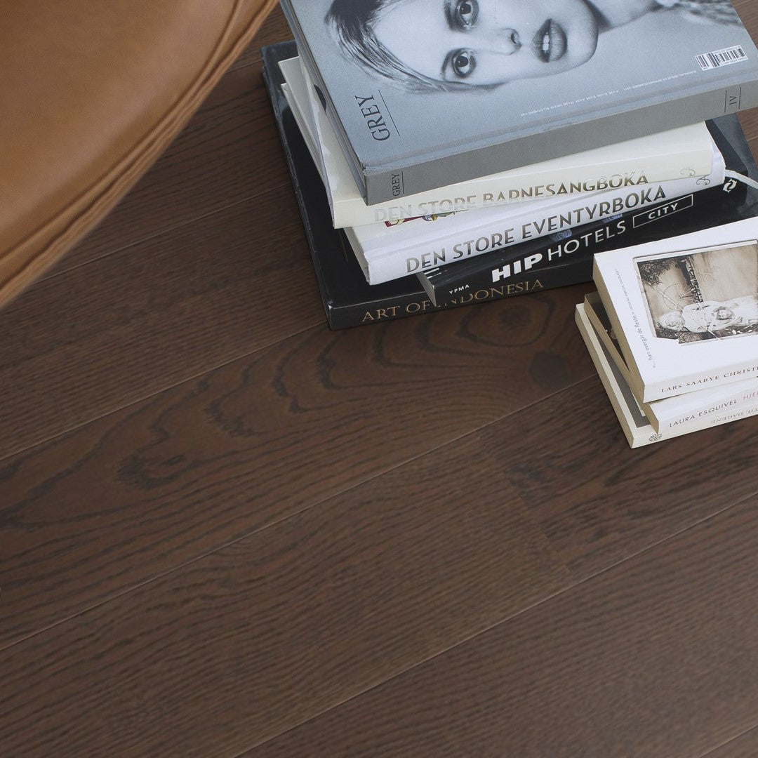 Boen Oak Smoked Marcato Oiled: Boen Oak Smoked Marcato (138mm) Oiled is a luxurious engineered wood flooring characterized by its deep, smoky brown color. The oil finish enhances the wood's natural texture and grain, providing a warm, inviting look with a soft matte sheen. Each 138mm wide plank offers a robust, elegant presence that complements both traditional and contemporary interiors. The oiled surface improves the floor's durability while allowing easy maintenance and repair. This flooring option balances aesthetic appeal with practical functionality for high-end spaces..