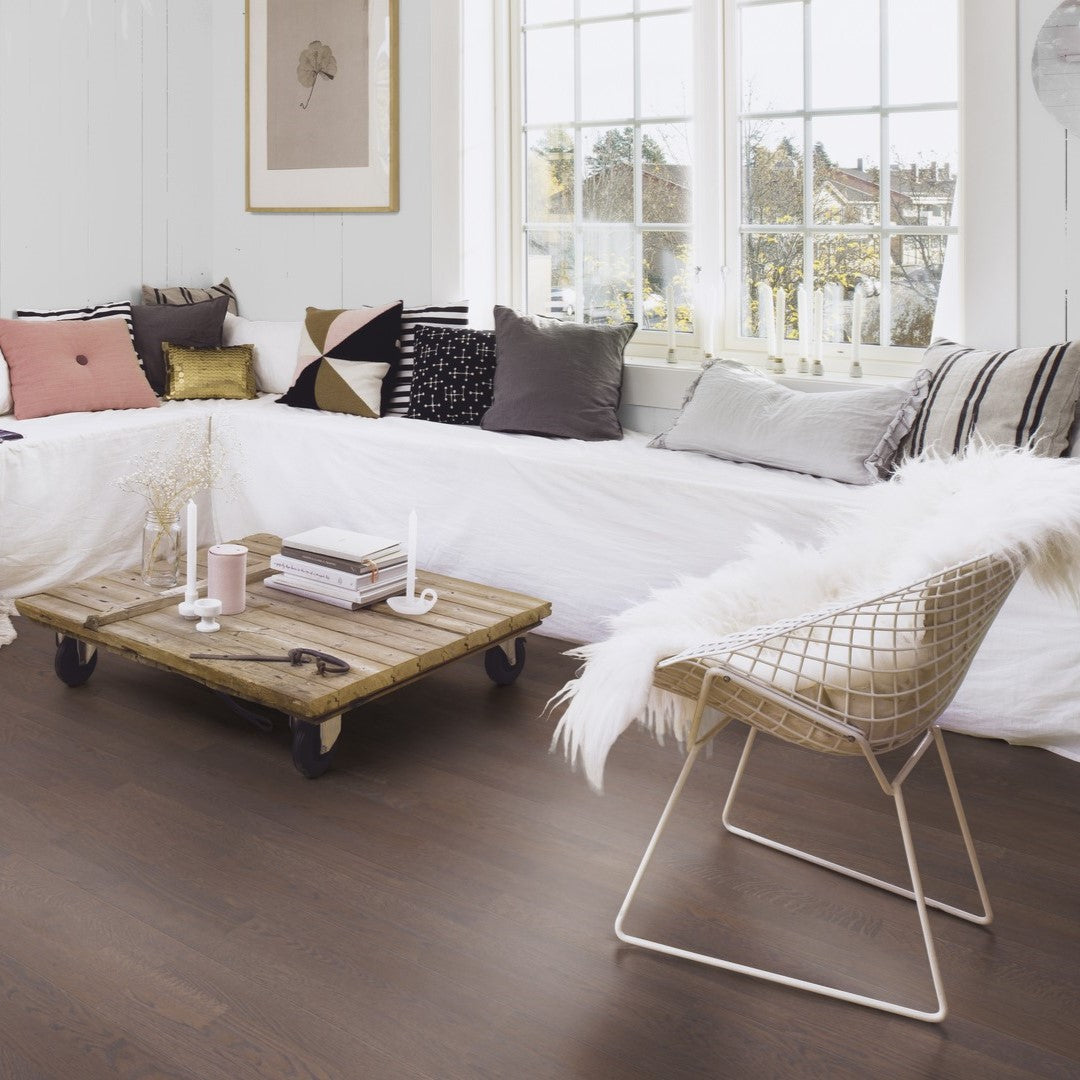 Boen 3 strip engineered wood floors will instantly liven up any room with their distinctive patterns. The real wood surface layer of each board is made up of 3 smaller strips of wood which come together to form a unique and beautiful single board. These 3 strip floors are great for creating a sense of space in small or narrow rooms. The Boen 3 strip range has colours for everyone, from smoky oaks to ash whites to dark walnut shades. The square edges of the planks mean the flooring has no bevels and the Boen X-Press Clic system allows the planks to fit smoothly together.