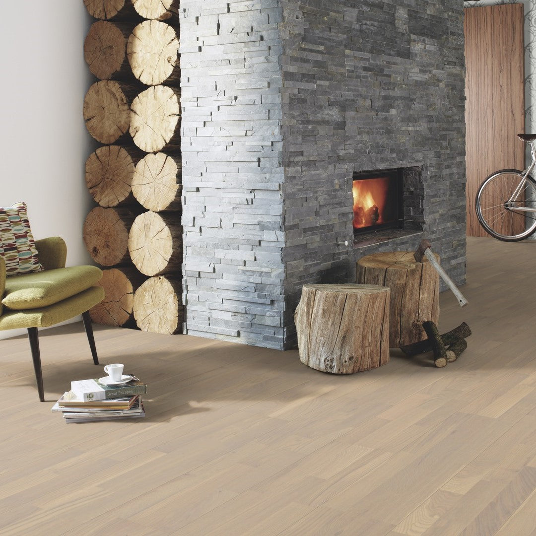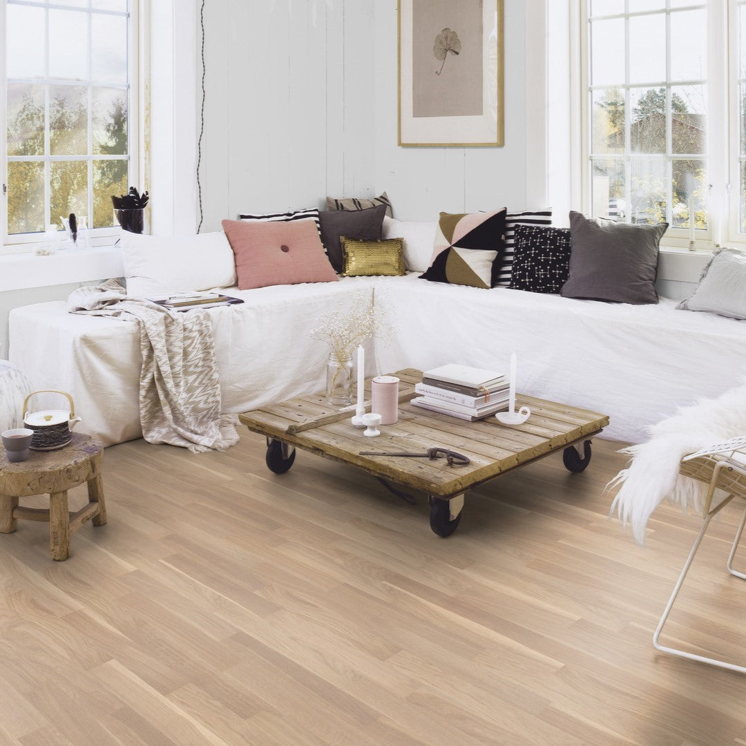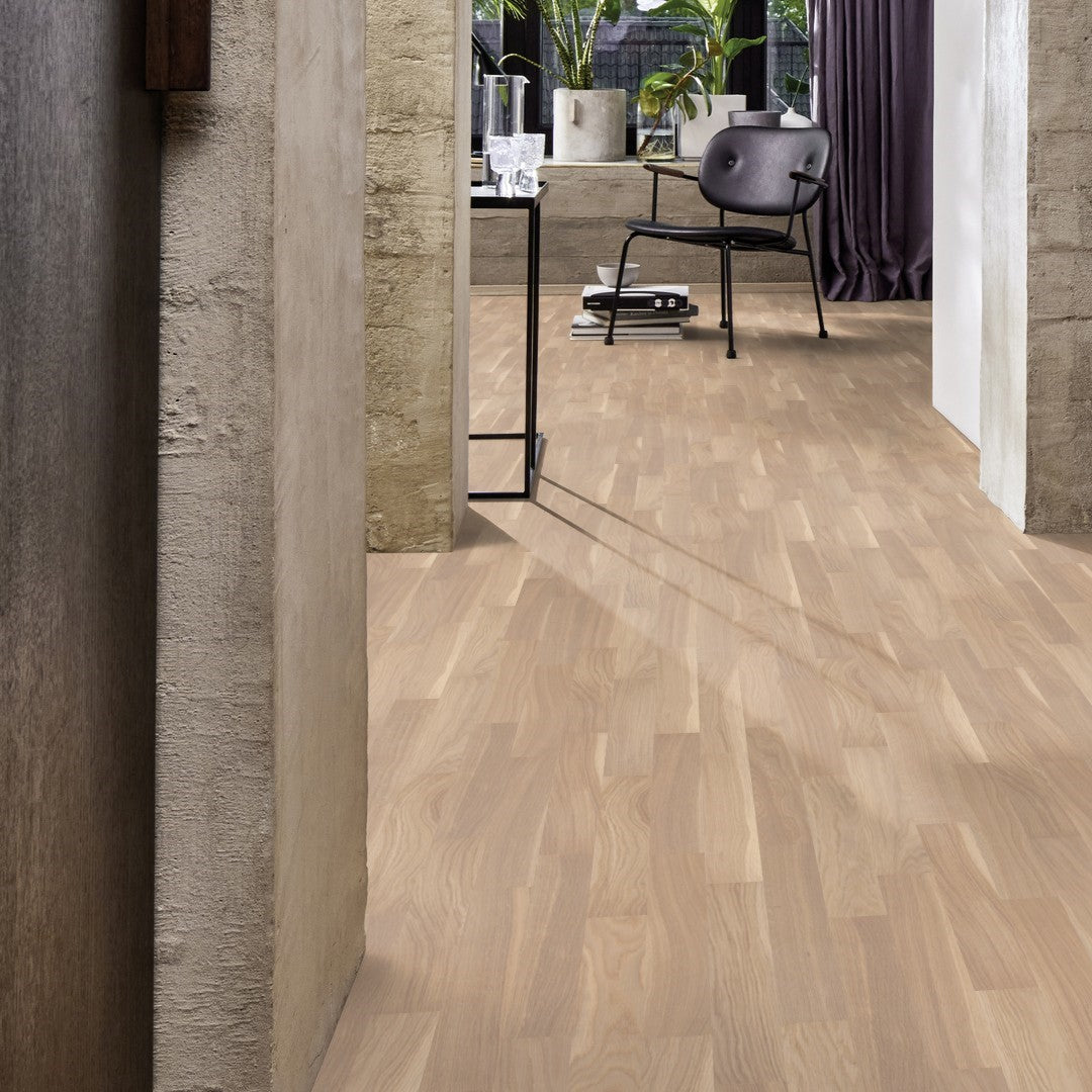 Boen Oak Pearl 3-Strip Live Natural: Boen Oak Pearl 3-Strip Live Natural flooring combines the elegance of oak with a contemporary finish. Its three-strip design showcases a variety of tones and grains, creating a dynamic look. The Live Natural finish enhances the wood's natural beauty while providing durability and easy maintenance. Ideal for modern spaces, it adds warmth and sophistication to any room.