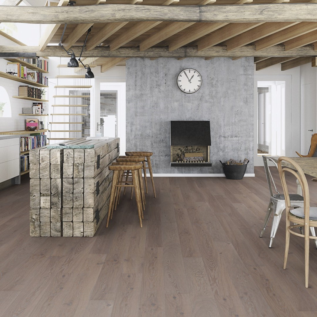 Boen Oak India Grey is a 14mm engineered wood floor featuring extra-wide 209mm planks for a contemporary, spacious feel. Its elegant grey tone adds a modern, neutral base that complements a range of interior styles. The brushed surface highlights the oak’s natural grain, offering texture and visual depth. Protected by Boen’s Live Pure lacquer, it delivers a durable, ultra-matte finish that maintains the wood’s raw, natural appearance. With a reliable click-lock system, this floor offers easy installation and long-lasting style for refined, modern living spaces.