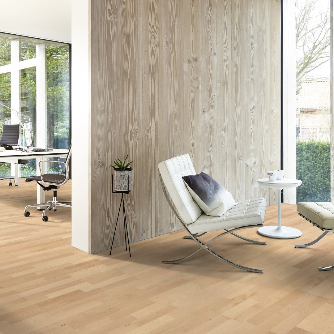 Boen Maple Canadian Andante 3-Strip Live Natural is a 14mm engineered wood floor crafted from premium Canadian maple. Its 3-strip design offers a classic, vibrant pattern, while the unbrushed, square-edged surface provides a smooth, clean finish. The Live Natural oil treatment enhances the wood's natural grain and offers robust protection against daily wear. Each plank measures 2200mm in length and 215mm in width, featuring a 3.5mm maple wear layer for longevity. The 5G Click system ensures straightforward installation. Compatible with underfloor heating, this flooring combines timeless elegance with modern performance, making it ideal for various residential spaces.