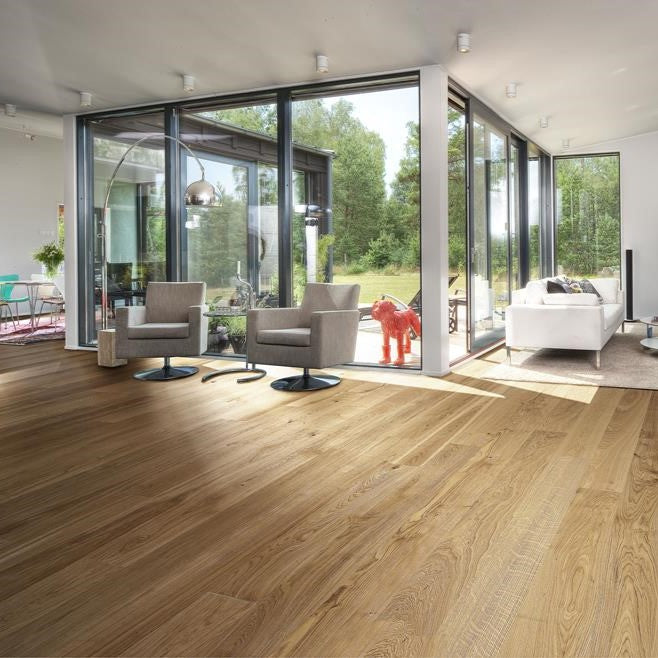The Kahrs Oak Hampshire boasts a matt lacquer finish that not only highlights the wood's authentic grain and rich tones but also provides a layer of protection. This finish ensures that your floors maintain their pristine look without the need for frequent refinishing, making them a practical solution for busy households. Additionally, the gentle matt effect subtly softens the appearance of your floors, providing a cozy and inviting atmosphere.