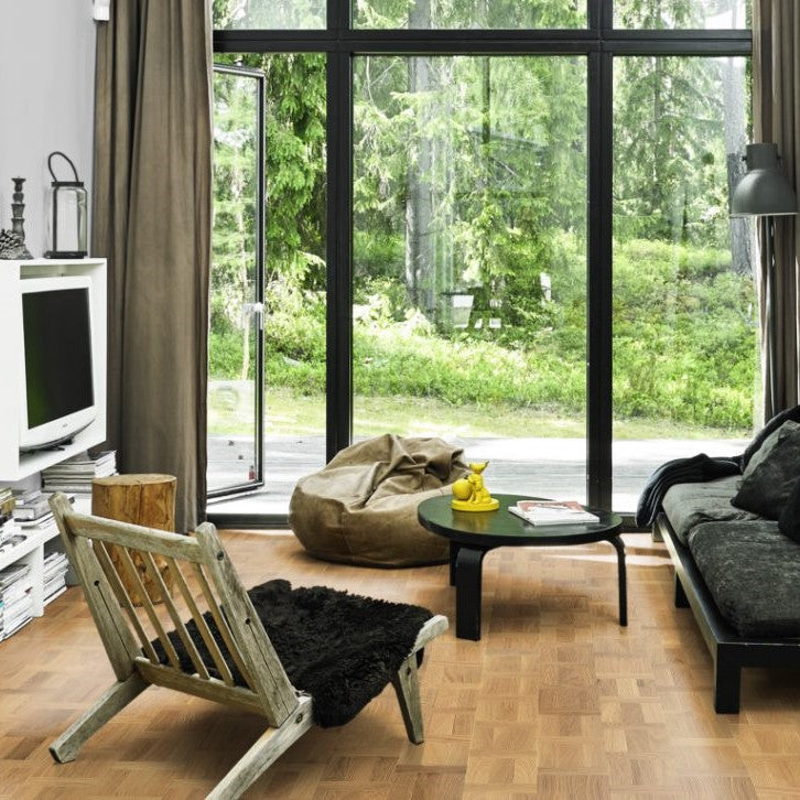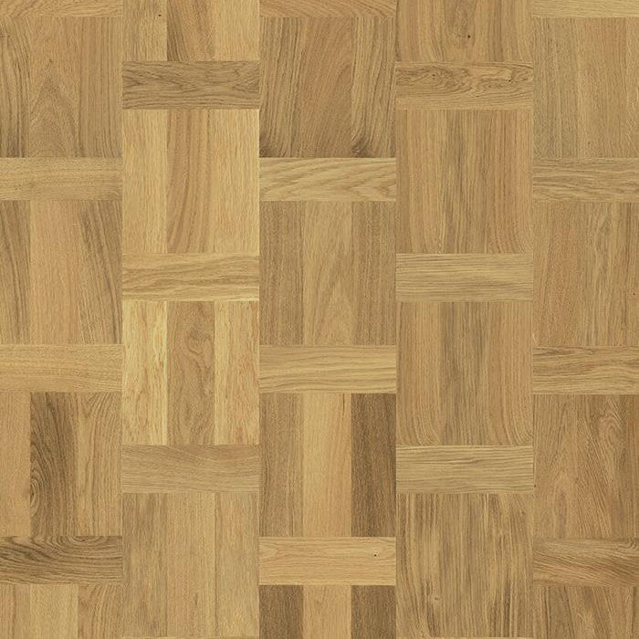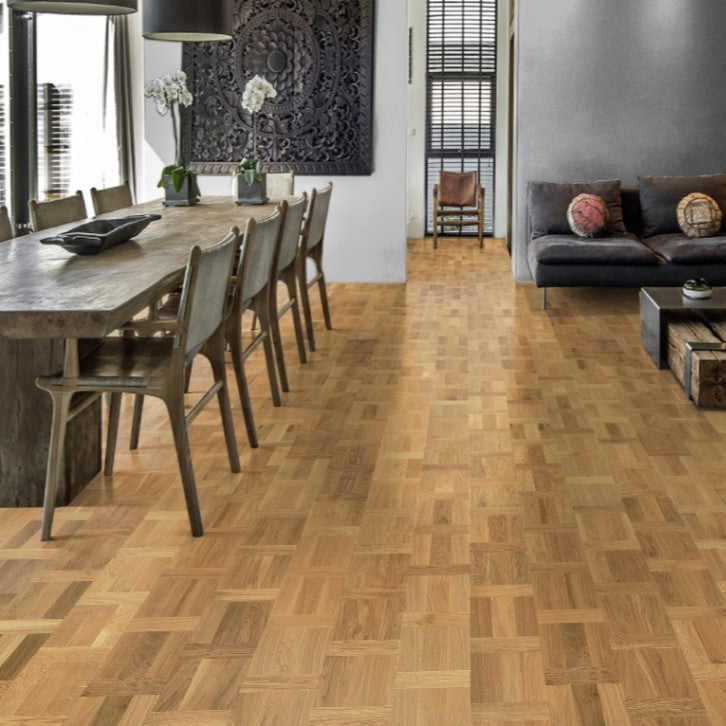If you are looking for a dutch patterned floor with a natural oak look then Kahrs Palazzo Rovere engineered wood flooring will be ideal. The boards have a total thickness of 15mm with a 3.5mm solid oak wear layer and the surface has been treated with a quality satin lacquer. This provides a soft and smooth surface in addition to a protective layer. This floor is highly durable and comes with a 30 year manufacturers warranty.