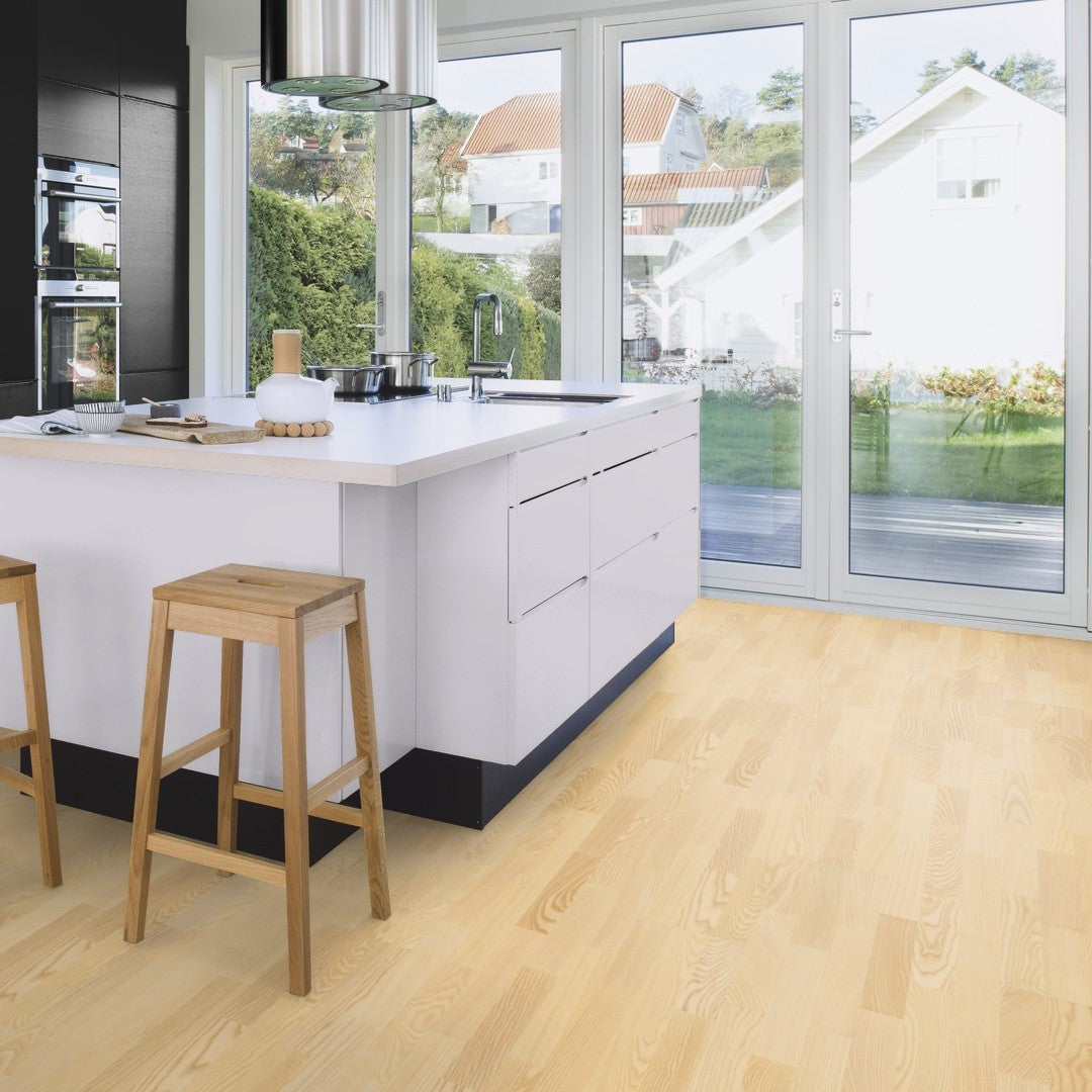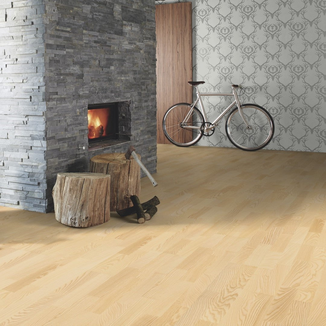 oen Ash Andante 3-Strip Live Natural is a 14mm engineered wood floor crafted from premium ash. Its 3-strip design offers a lively, classic pattern, while the unbrushed surface provides a smooth, clean finish. The Live Natural oil treatment enhances the wood's natural grain and offers robust protection against daily wear. Each plank measures 2200mm in length and 215mm in width, featuring a 3.5mm ash wear layer for longevity. The square-edged design ensures a seamless appearance, and the 5G Click system allows for straightforward installation. Suitable for underfloor heating, this flooring brings timeless elegance to any interior.