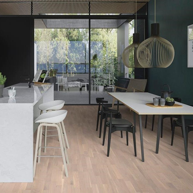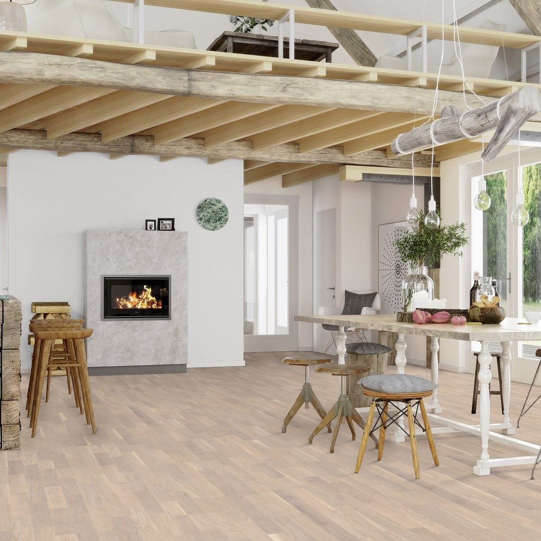 Boen Oak Pearl 3-Strip Live Natural is a 14mm engineered oak floor that brings a light, airy feel to any interior. Its three-strip design features multiple oak strips per plank, creating a dynamic and visually engaging surface that adds depth and texture. The unbrushed finish offers a smooth, clean texture, allowing the natural grain and subtle colour variations of the oak to shine through. Treated with Boen’s Live Natural oil, it provides a breathable, durable surface that enhances the wood's authentic character. Ideal for both modern and traditional settings, this flooring combines elegance with lasting performance.