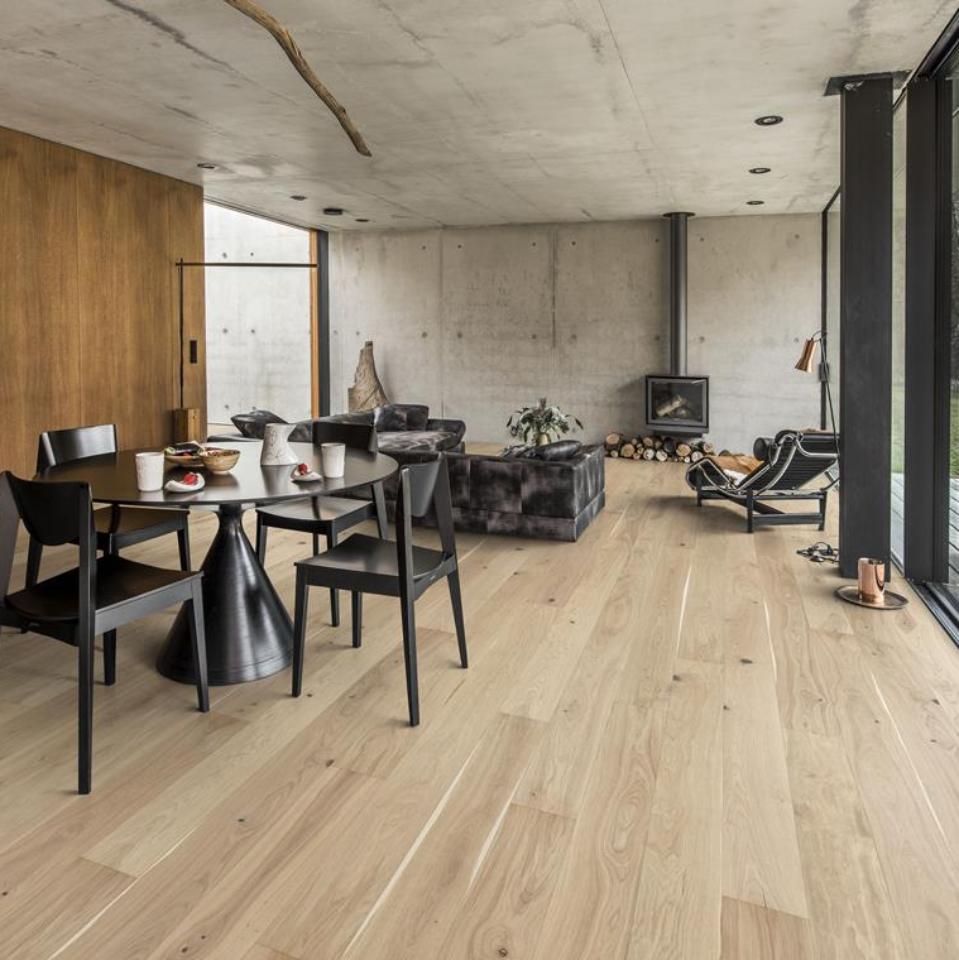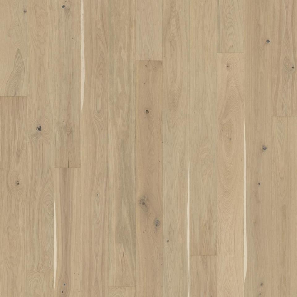 Unleash the natural beauty of your space with Kahrs Lux Oak Eggshell. This single-strip oak floor features a subtle white transparent stain that reveals the unique gradations of the wood. The classic full plank look is enhanced by four-sided micro-bevelling, while the brushed finish brings out the natural character of the grain. Protected by an ultra-matt lacquer, this floor will withstand daily wear while maintaining its sleek and newly sawn appearance.