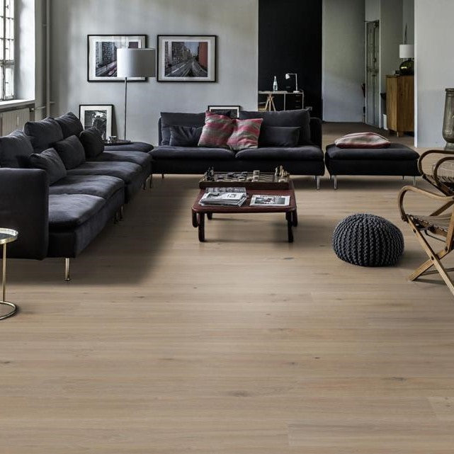 If you would like a floor with a light outdoor feel then Kahrs Oak More engineered wood flooring will be an excellent choice. This floor has a rustic surface with a flowing grain beautified through the handscraping and brushing. The cool grey colours with warmer variations throughout gives the appearance of vintage worn down planks. This Supreme Smaland collection floor also comes with a 30 year residential guarantee.