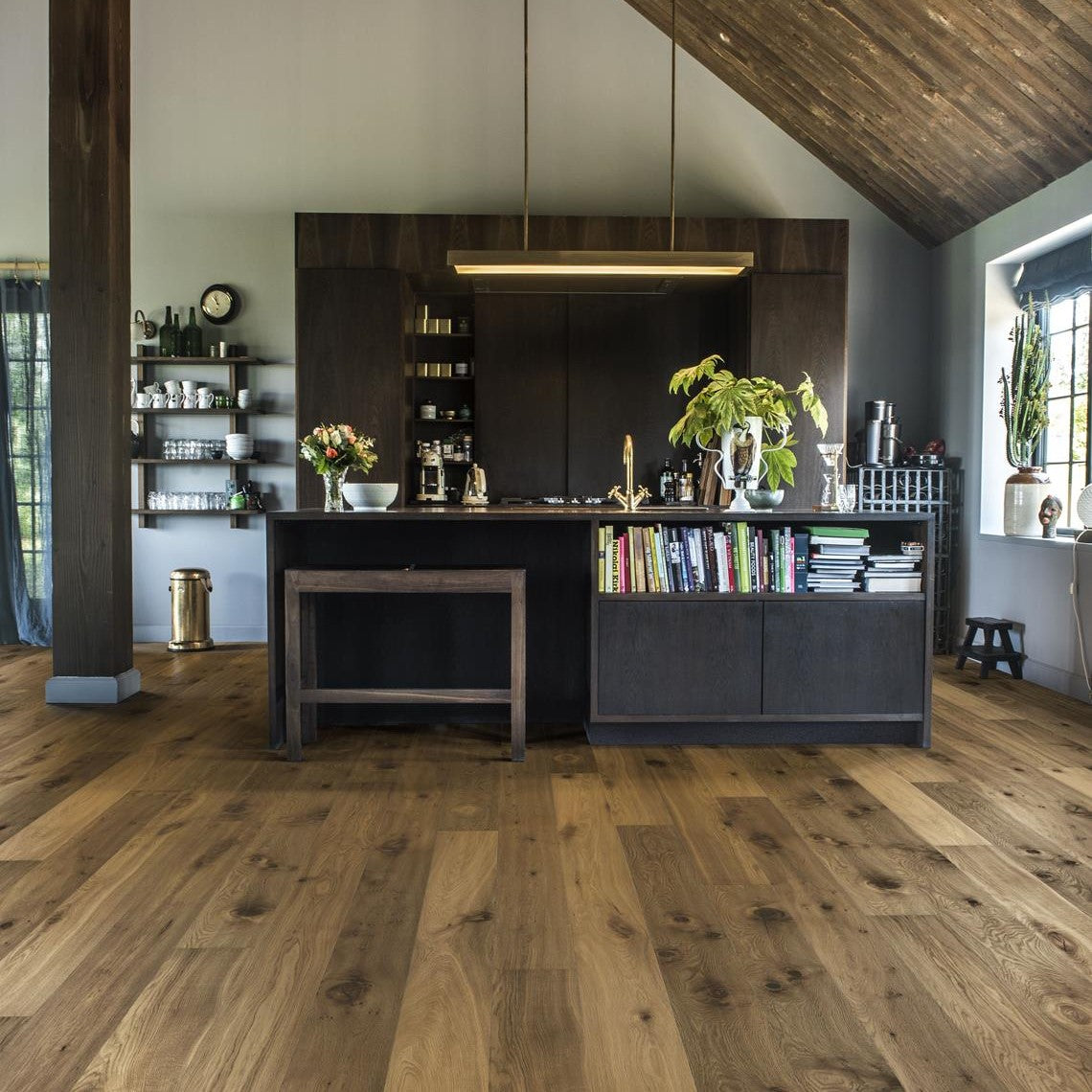 This Supreme Smaland Kahrs Oak Sevede floor will be sure to bring your home alive. It is one of the darkest floors in the collection and due to the smoking process exhibits beautiful contrasting tones of amber and coffee. The bevelled planks have a rustic surface which has been handscraped and brushed, bringing the natural wood grain to life. The oiled finish adds a final design statement as well as giving a high quality coat of protection.