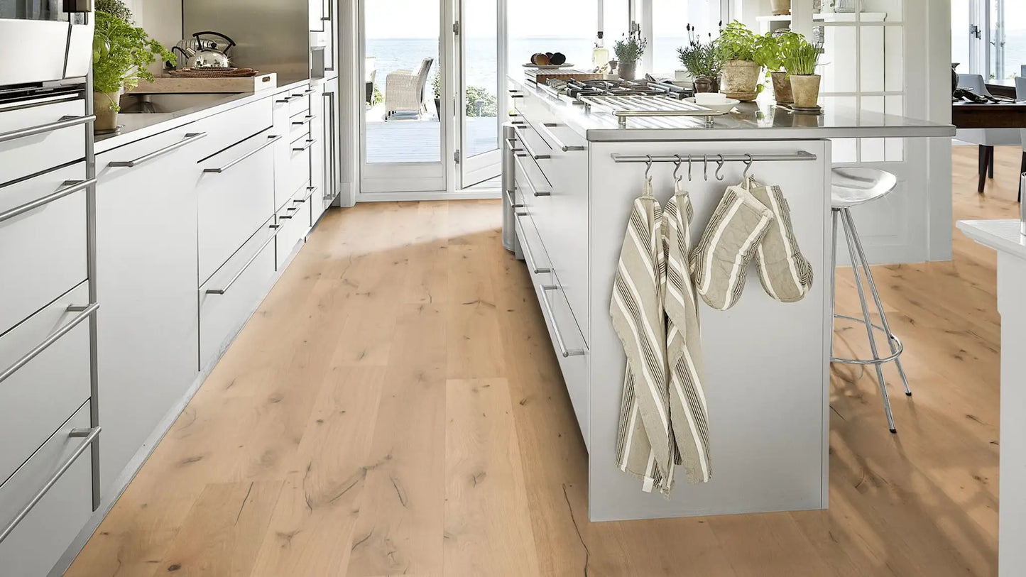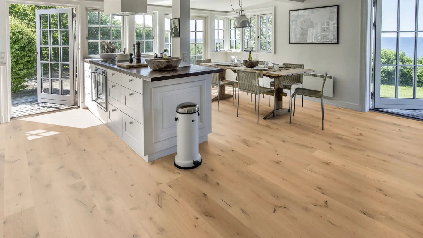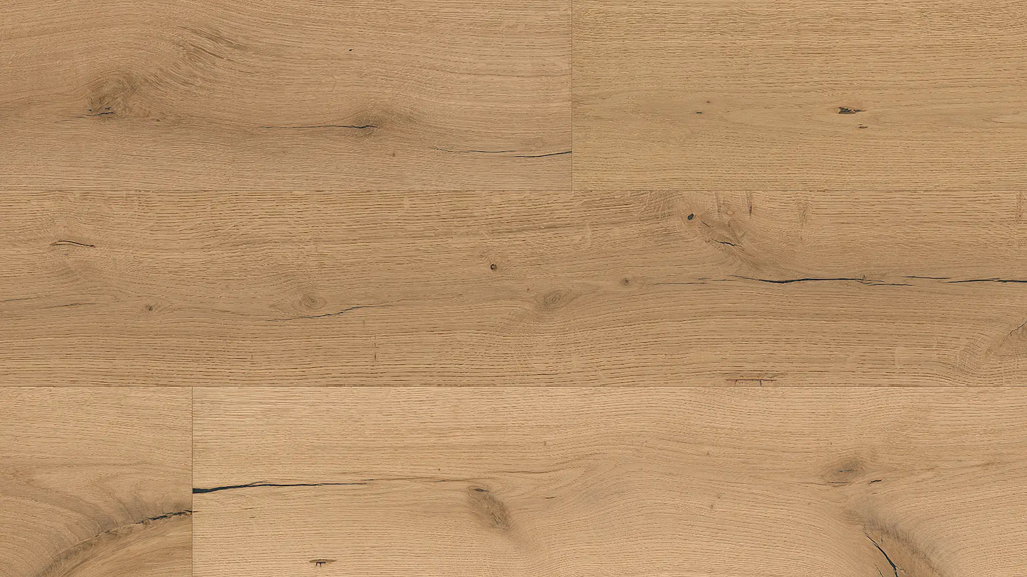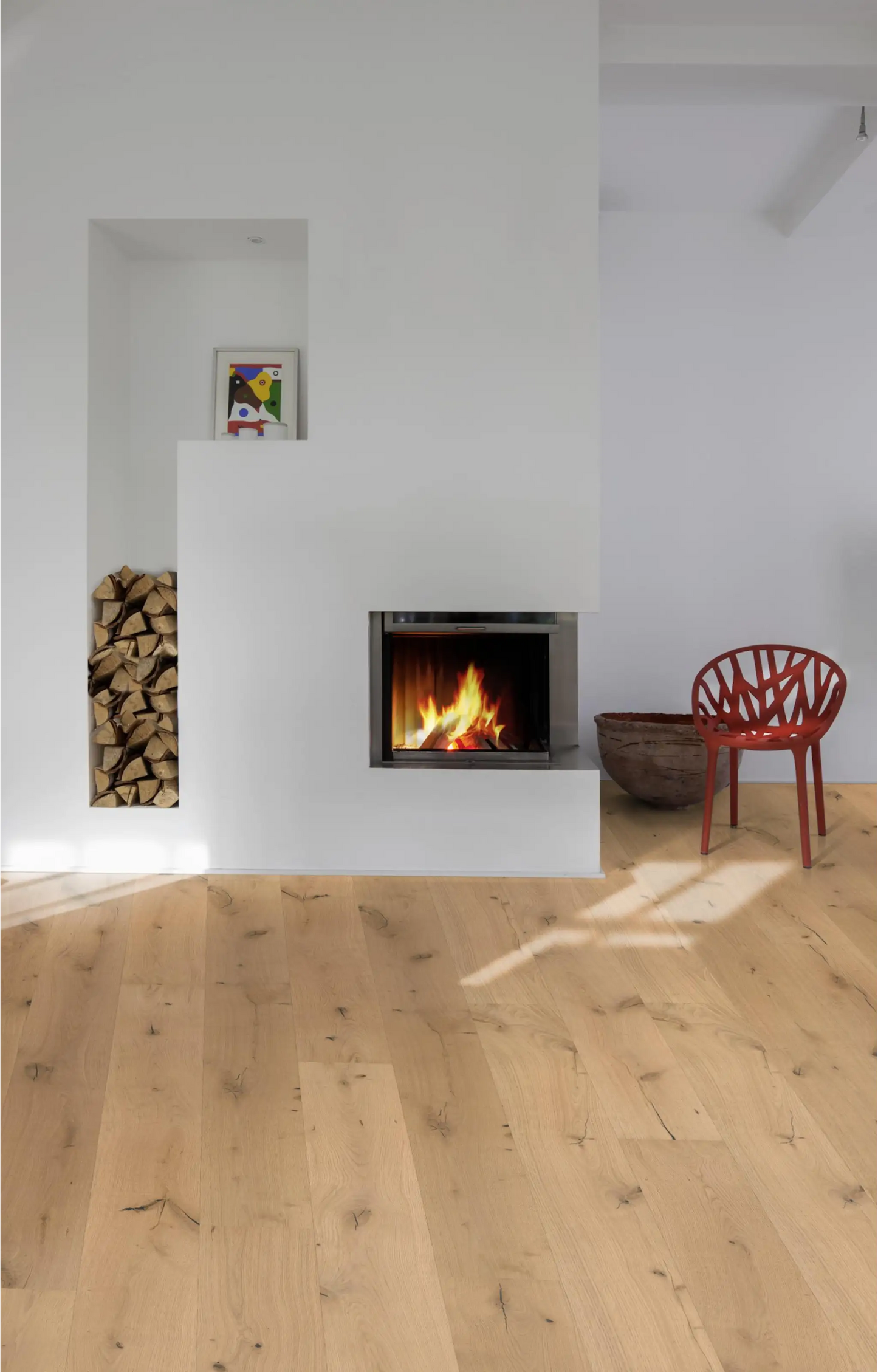 Kahrs Tempest Oak Boreas 141XDDEKF1KW225 is an engineered oak wood floor from Kährs’ Tempest Collection. It features long, wide planks (220 mm × 2200 mm × 14 mm) with a brushed and oiled surface that brings out the natural grain, knots and rustic character of the wood. The 3‑layer construction has a 2.5 mm oak wear layer on a pine/spruce core and uses a Woodloc® 5G joint for floating or glue‑down installation on floors. Colour varies naturally from light to darker tones, with visible sapwood and artisan‑style surface texture. Like traditional oiled floors, it should be oiled after fitting and will mellow in colour over time, imparting a timeless, lived‑in look to interior spaces.