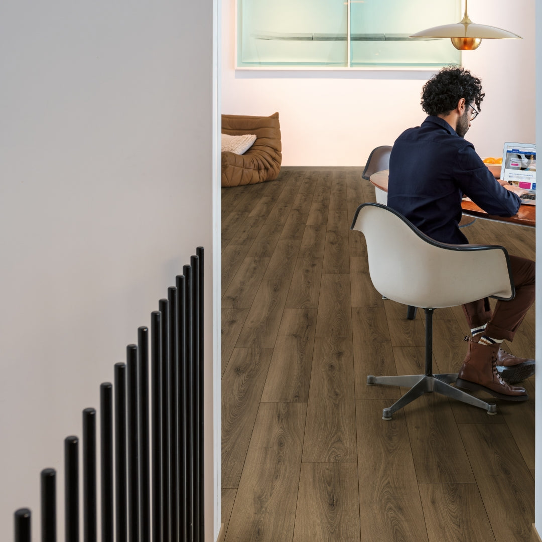Quickstep Classic, Warm Brown Oak, laminate flooring, Uniclic installation system, scratch-resistant, durable, moisture resistant, easy installation, wood mimic, sustainable, cost-effective, home renovation, office flooring