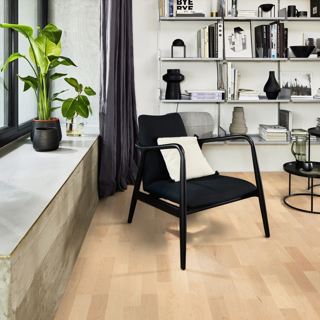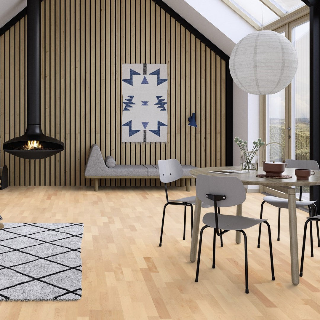 Boen Maple Canadian Andante 3-Strip Live Matt is a 14mm engineered wood floor crafted from premium Canadian maple. Its 3-strip design offers a lively, classic pattern, while the unbrushed surface provides a smooth, clean finish. The Live Matt lacquer treatment enhances the wood's natural grain and offers robust protection against daily wear. Each plank measures 2200mm in length and 215mm in width, featuring a 3.5mm maple wear layer for longevity. The square-edged design ensures a seamless appearance, and the 5G Click system allows for straightforward installation. Suitable for underfloor heating, this flooring brings timeless elegance to any interior.