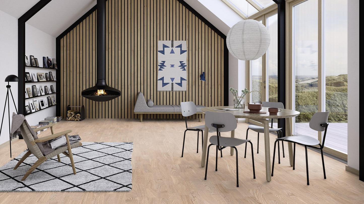 Boen Oak White Andante 3-Strip Live Natural is a 14mm thick engineered wood floor designed for timeless appeal and reliable durability. The 3-strip pattern provides a dynamic, traditional appearance, ideal for a range of interiors. Unbrushed for a smooth, clean surface, the oak’s subtle white staining adds a fresh, modern twist while retaining its natural charm. Treated with Boen’s Live Natural oil finish, it enhances the wood’s organic character and offers deep protection through natural oils. This flooring is well-suited for residential use, compatible with underfloor heating, and balances contemporary style with classic warmth and texture.