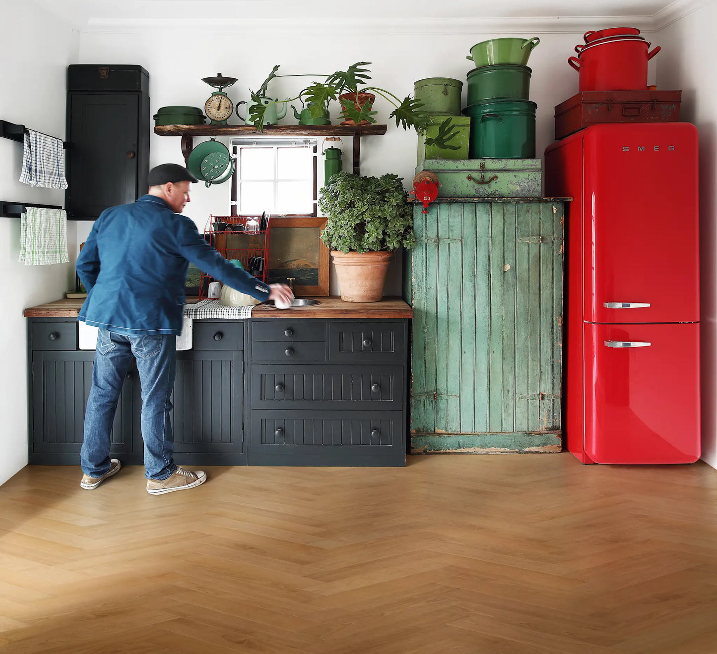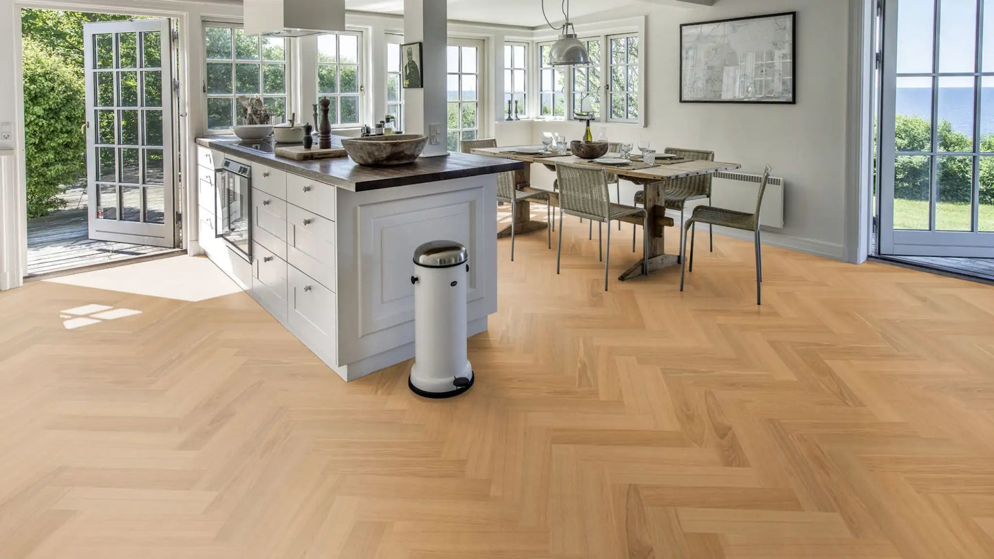 Kahrs Oak Herringbone AB Natural is a high‑quality engineered oak parquet floor in a classic herringbone pattern. Made by Kährs, this floor uses carefully selected oak with moderate natural colour variation and a few small knots for authentic character. It’s constructed as a two‑layer board with a 3.5 mm oak wear layer on a stable birch plywood core, sized 120 × 600 × 11 mm, and designed to be glued down for a traditional installation. The surface is brushed and finished with natural oil to enhance the grain and texture, and boards are micro‑bevelled on all four sides for definition. Suitable for underfloor heating and interior spaces, it delivers timeless elegance and durable performance rooted in reputable woodworking tradition.