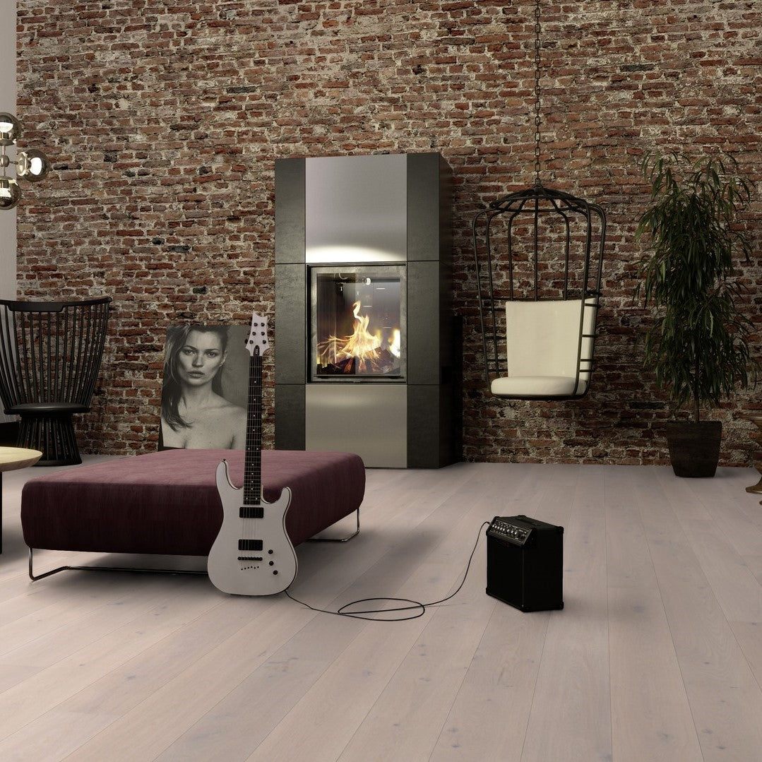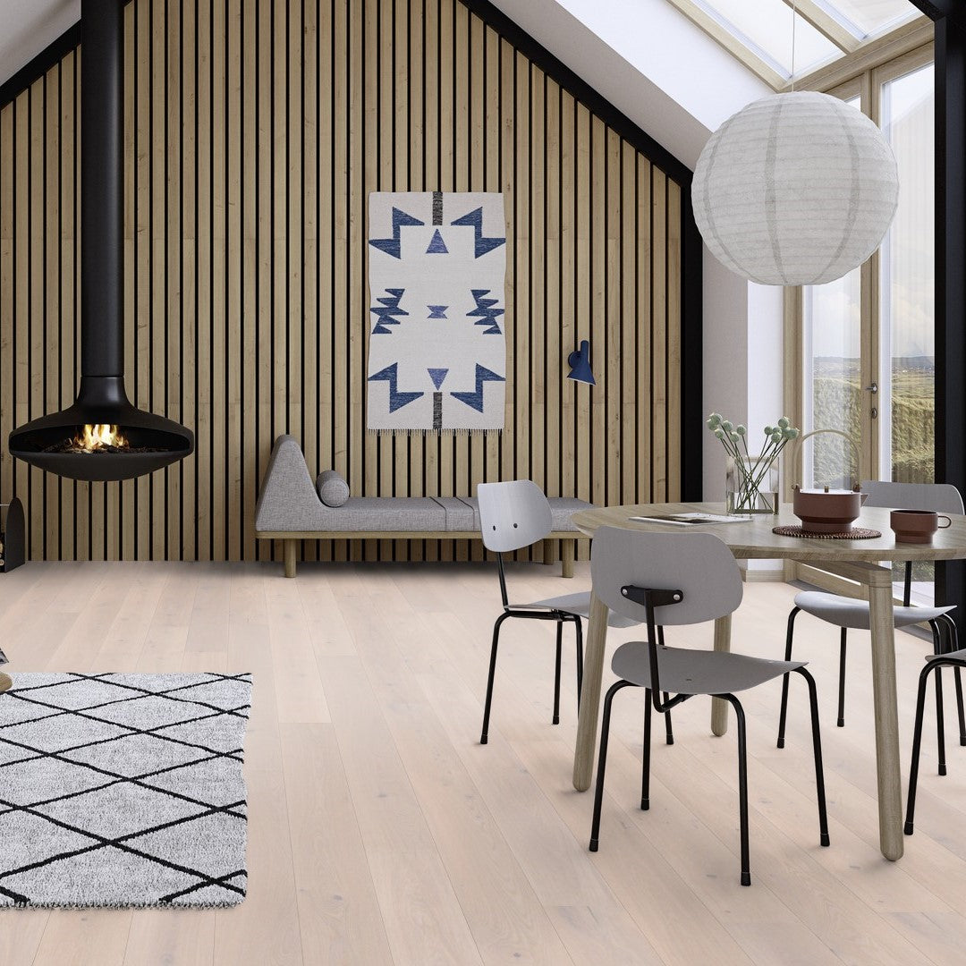 Boen Oak Coral Animoso is a refined 14mm engineered wood floor that brings a light, airy feel to any interior. The 138mm-wide planks offer a clean, balanced appearance, ideal for both modern and traditional settings. Featuring a soft white tone, the Coral finish subtly brightens spaces while preserving the natural warmth of oak. The brushed surface enhances the grain texture, adding visual depth and tactile appeal. Treated with Boen’s Live Natural oil, it provides a breathable, durable finish that protects the wood and enhances its authentic charm. Perfect for serene, elegant interiors.