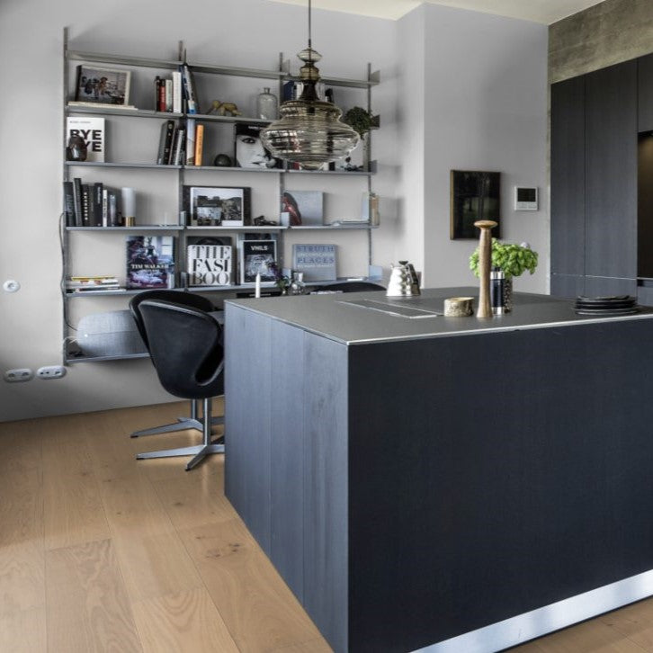 Unlike most of the other floors in the collection Kahrs Oak Nouveau White engineered wood flooring has not been treated with staining or smoking, which allows the natural colour and character of the finest quality oak to shine forth. The rustic character of the wood grain is further heightened by the process of brushing which is then locked in with a protective matt lacquer.