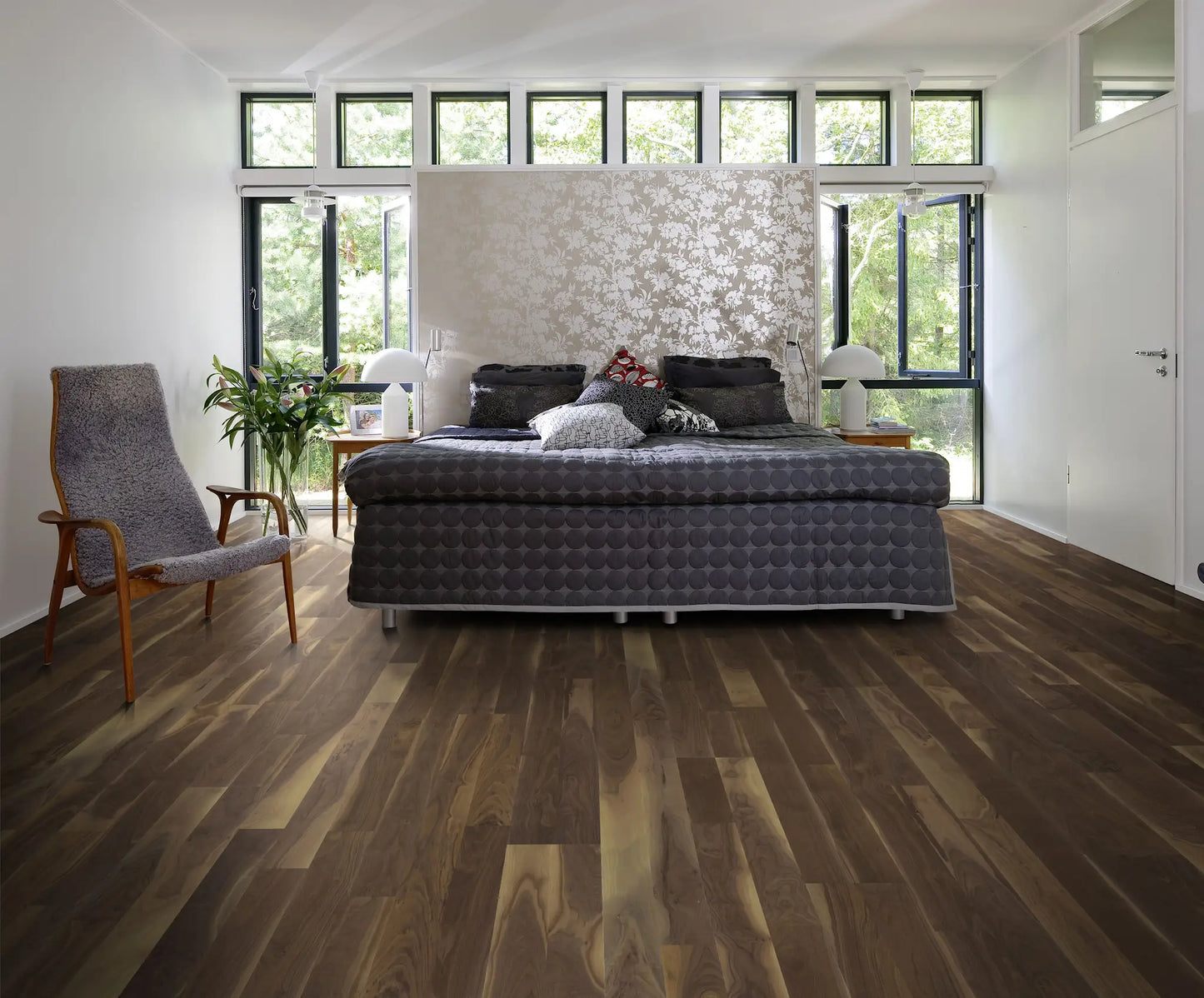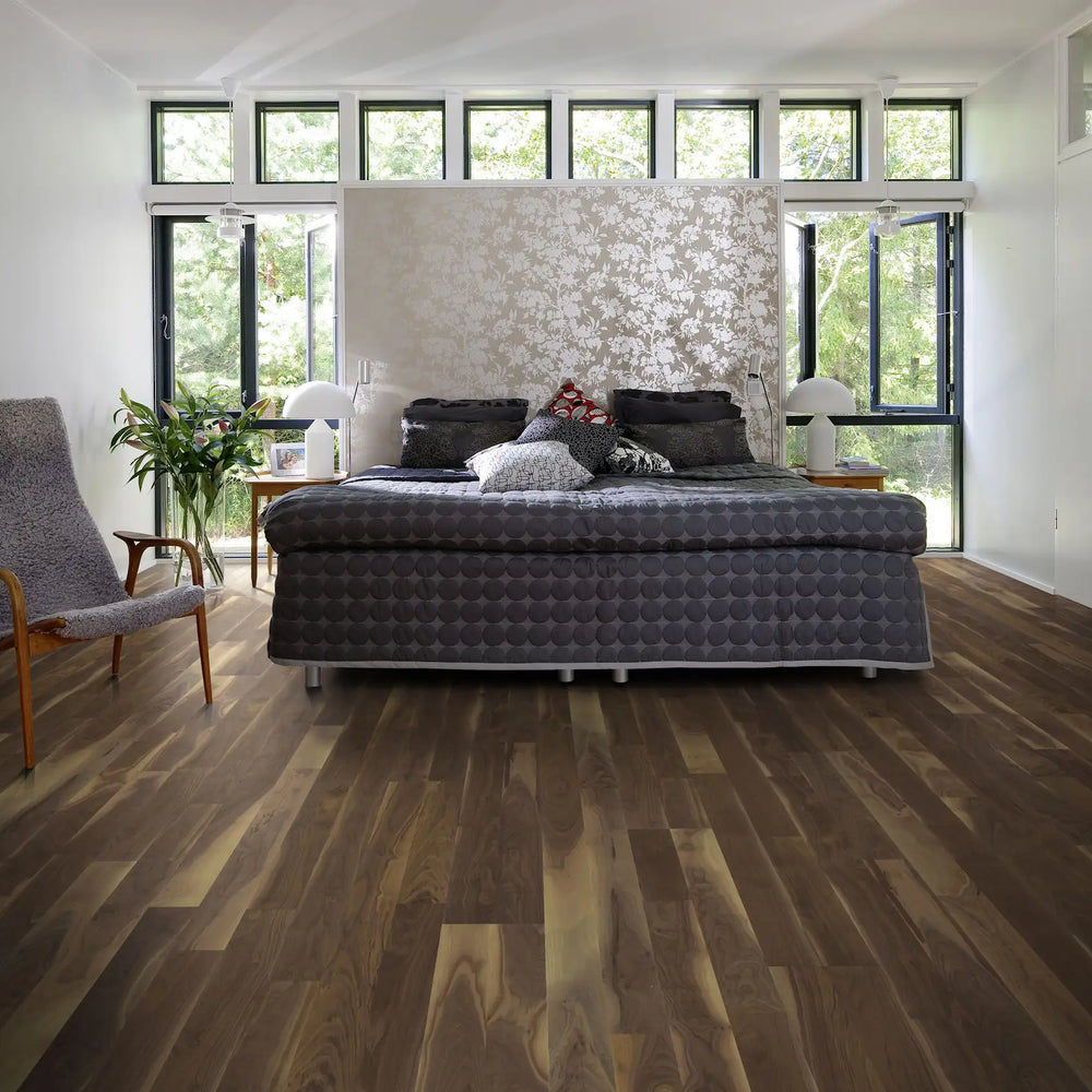 Kährs Walnut Georgia is a 2-strip, three-layer engineered walnut parquet from their American Naturals collection. kahrs.com+1 Each plank measures 200 × 2421 × 15 mm, with a 3.5 mm wear layer of solid walnut over a pine/spruce core. kahrs.com+1 The surface is brushed and oiled, enhancing the grain texture and natural feel. kahrs.com+1 Its colour palette is lively and varied, ranging from vanilla cream tones to richer charcoal browns, with naturally occurring sapwood and knots permitted under the “lively” grade. kahrs.com+2kahrs.com+2 The boards install via the Woodloc 5S click system, and may be laid floating or glued down. kahrs.com+1 It’s suitable for underfloor heating and comes with a 30-year wear warranty. kahrs.com
