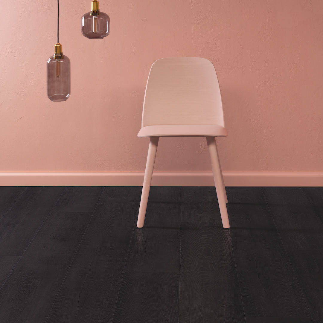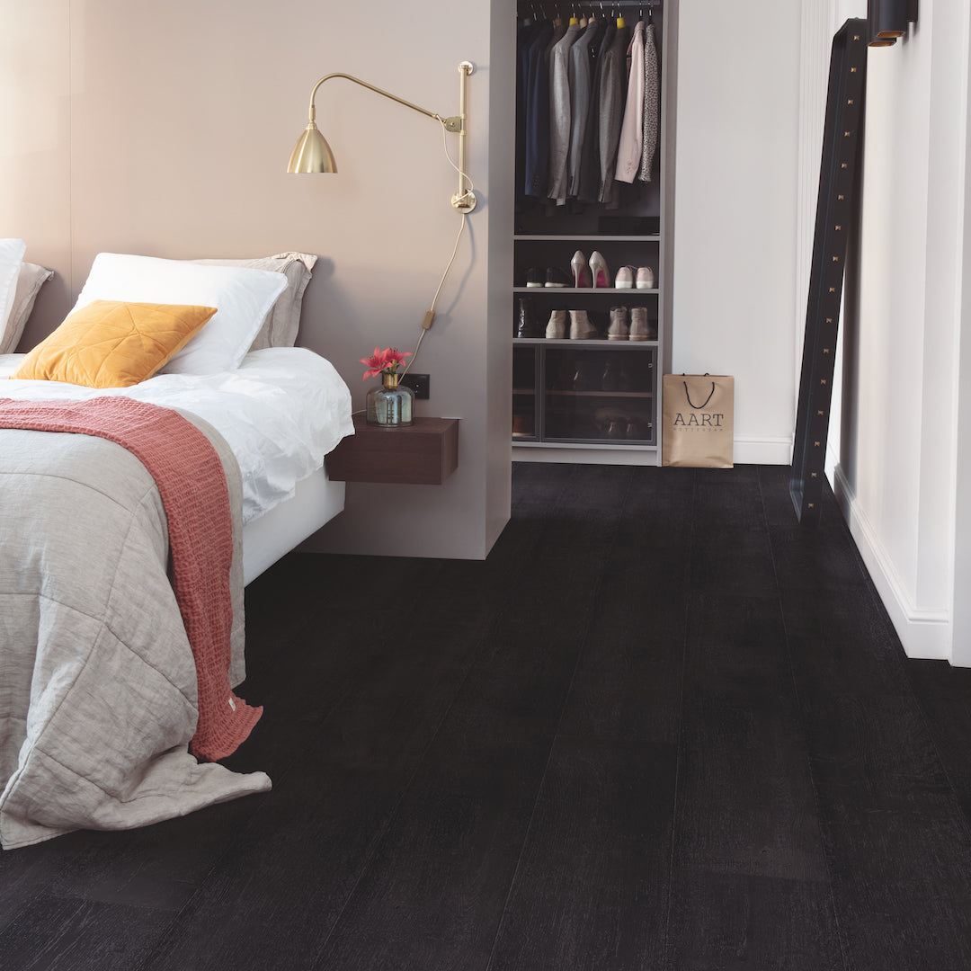 Quickstep flooring, painted oak black, durable hardwood floors, easy installation, modern flooring solutions, luxury oak texture, sophisticated floor design, Uniclic installation system, scratch-resistant floors, black oak floor.