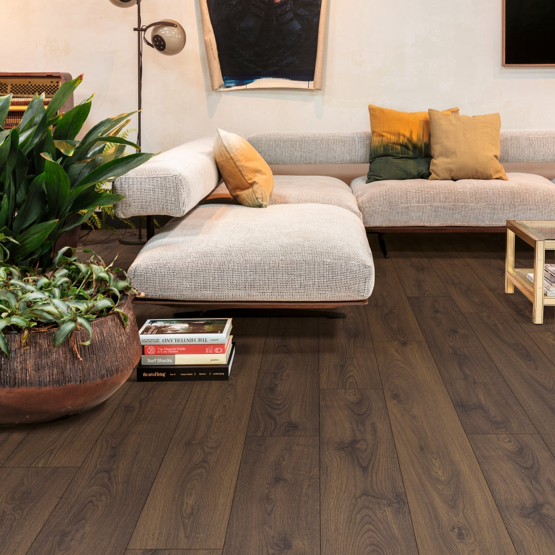 Kronoswiss Grand Selection Evolution Graphite Oak (Waterproof Resistance): The offers a striking dark oak finish with a deep, textured surface. This waterproof laminate is designed to withstand moisture and heavy foot traffic, making it ideal for both residential and commercial spaces. Its robust construction and realistic wood appearance make it a versatile and stylish choice.