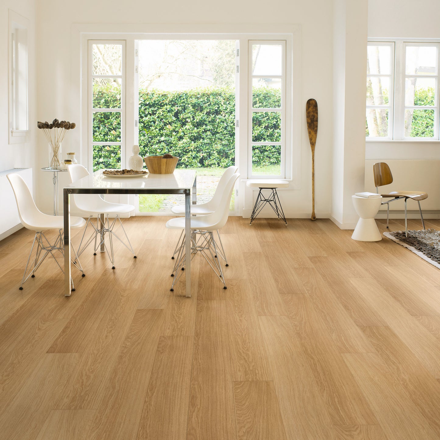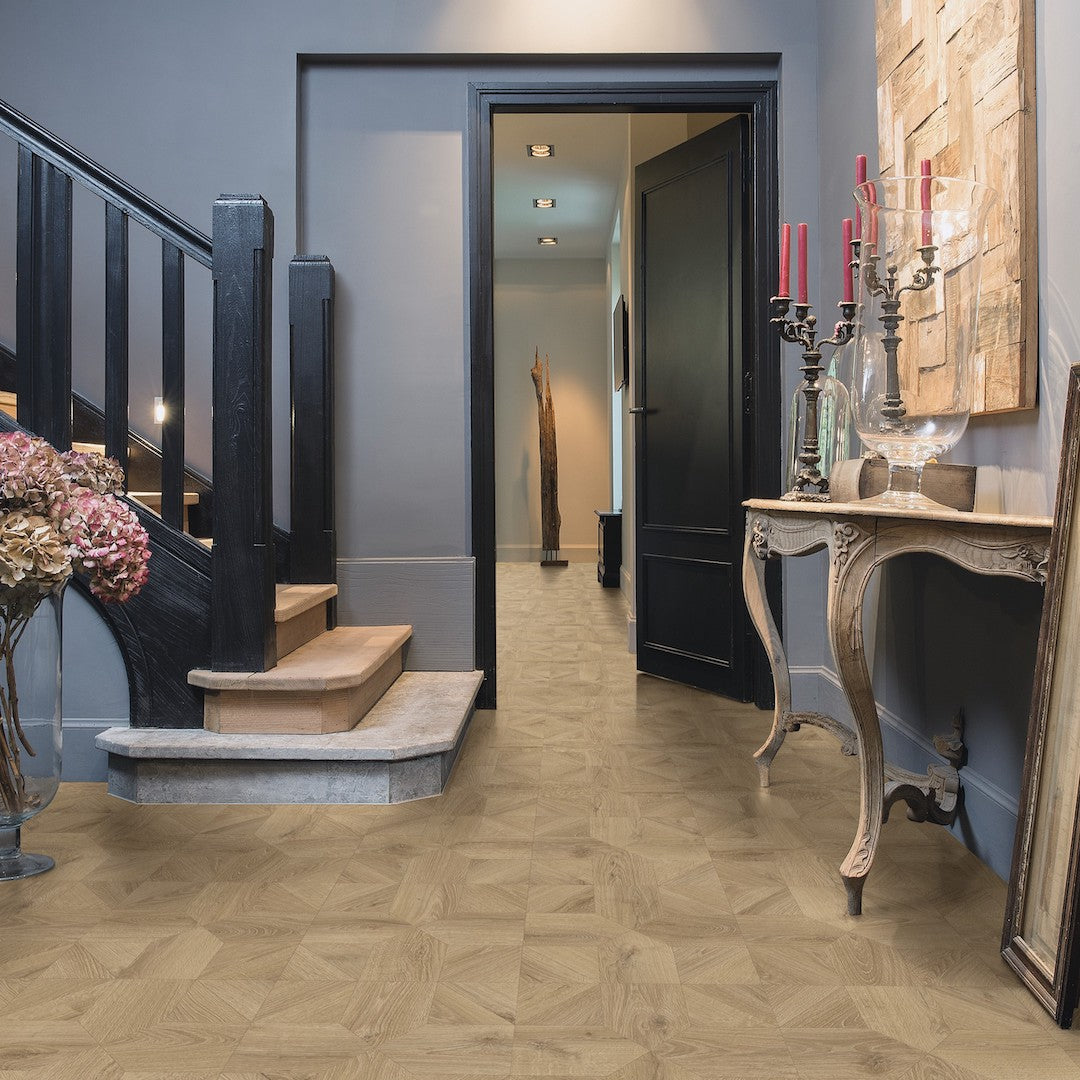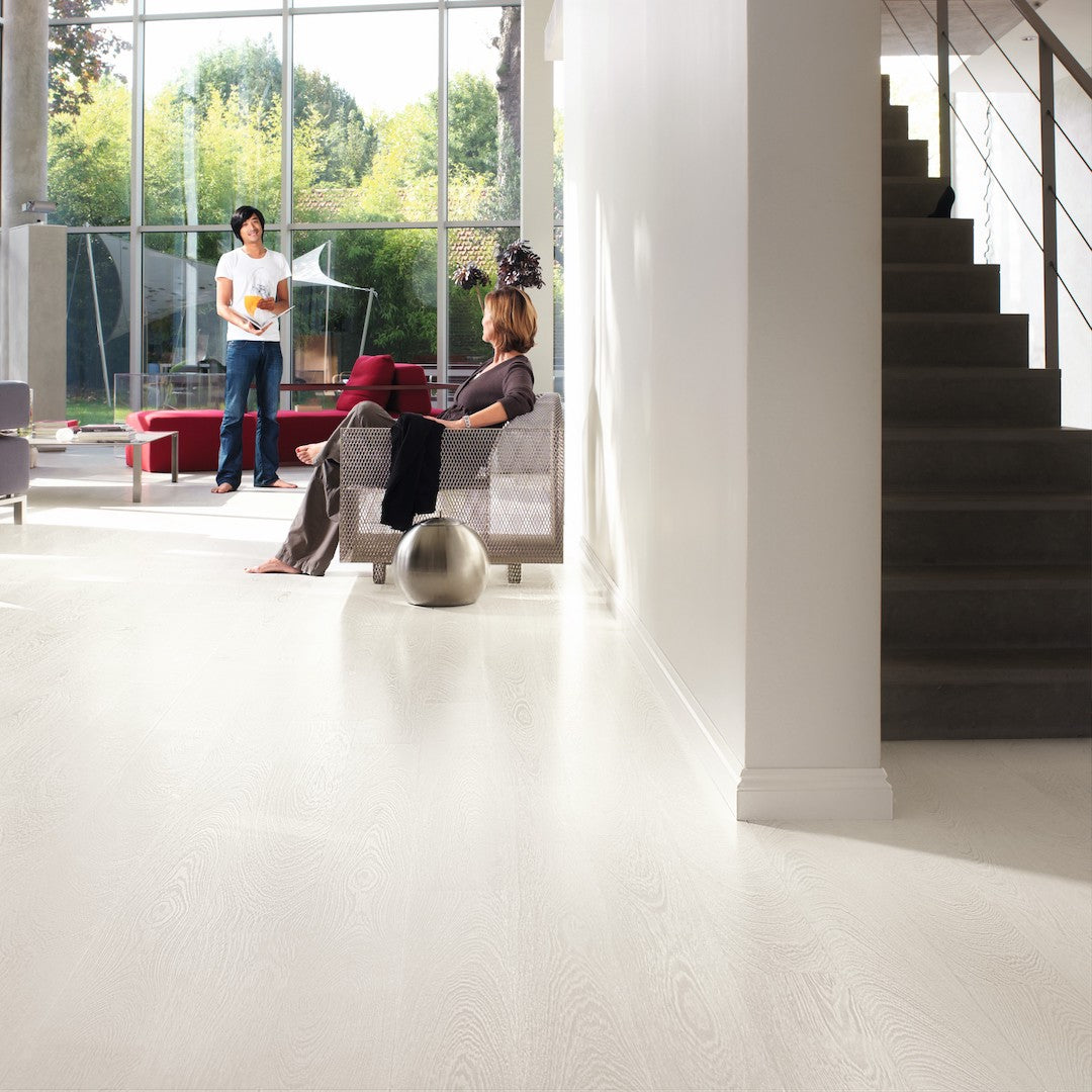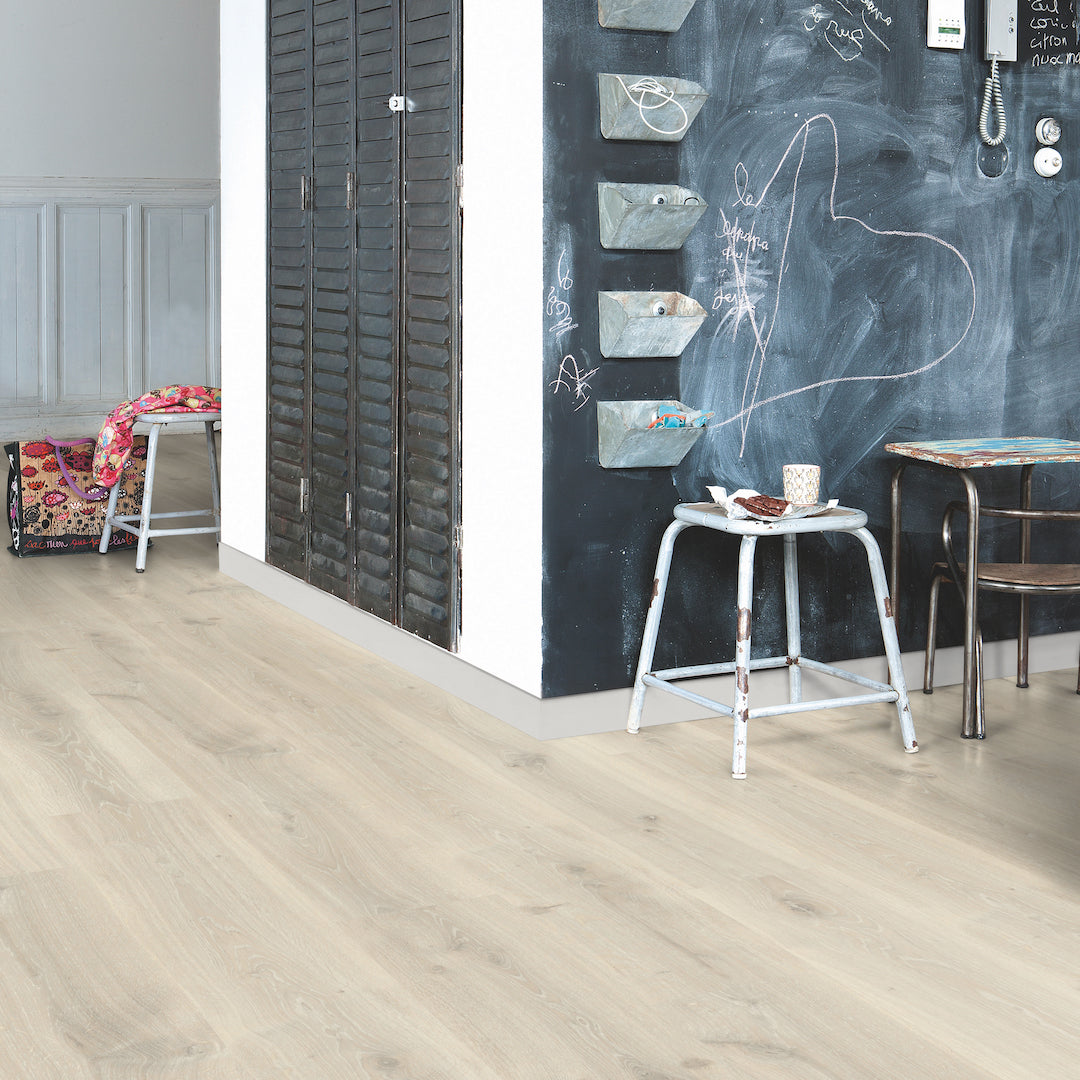 Quick-Step Largo Cambridge Oak Natural Plank (Waterproof Laminate): The Quick-Step Largo Cambridge Oak Natural Plank flooring combines the timeless appeal of oak with advanced waterproof technology. This laminate features a natural oak finish with realistic wood grain and texture, making it indistinguishable from real wood. Its waterproof design ensures that spills and moisture do not penetrate the surface, providing peace of mind in areas like kitchens and bathrooms.