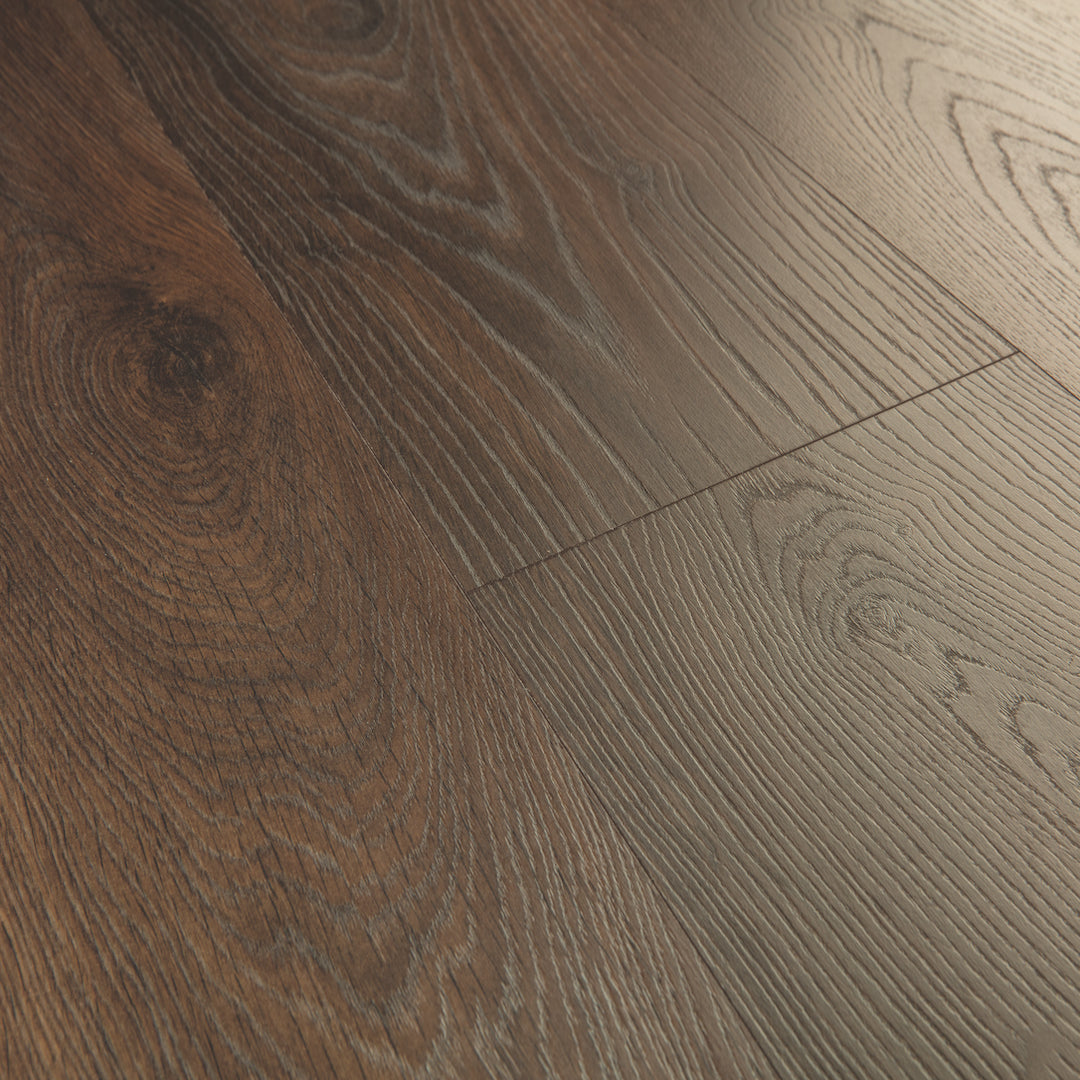 The Quickstep Classic Peanut Brown Oak features a rich, deep brown hue with natural-looking grain patterns, adding warmth and elegance to any room.