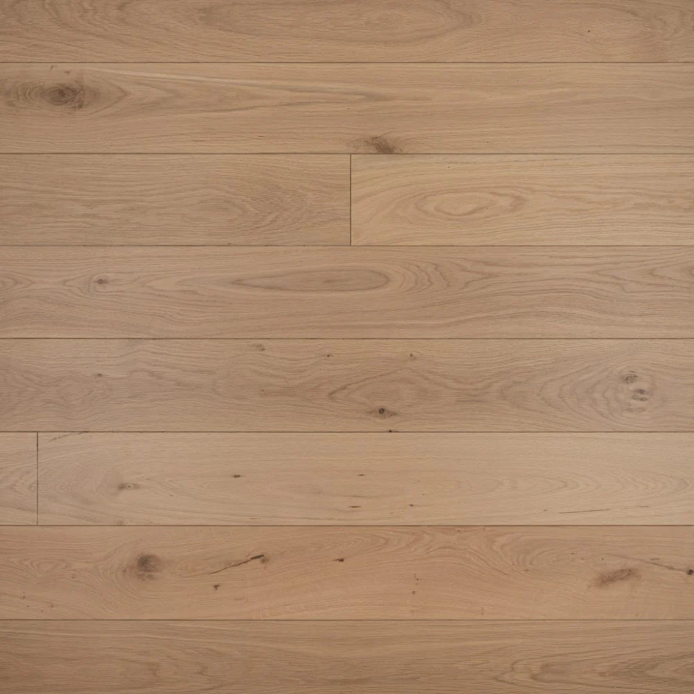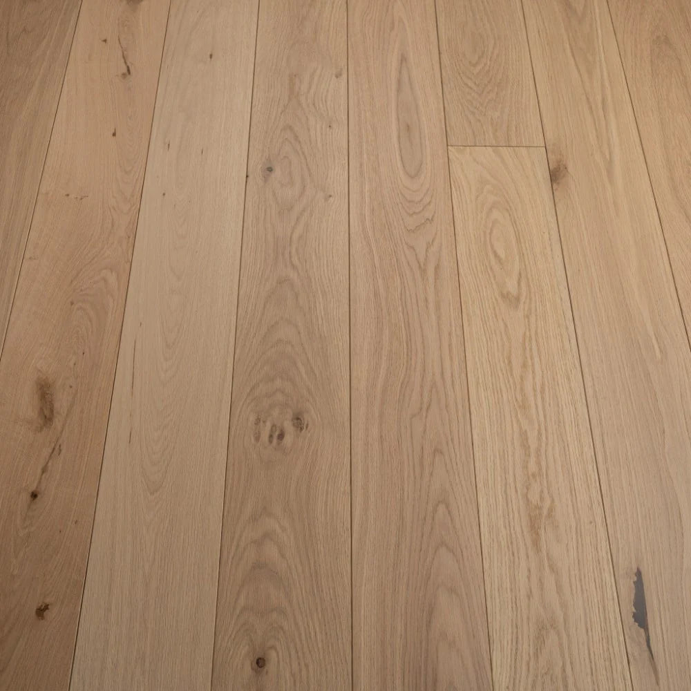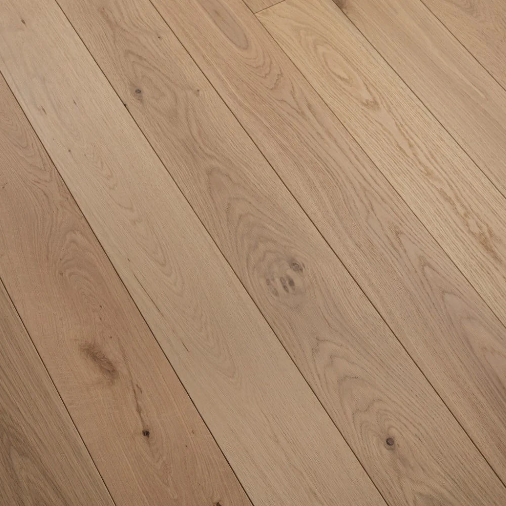 Engineered 14mm Oak flooring with Invisible Finish Lacquer offers a clean, natural-grade appearance with subtle grain and minimal knots. The invisible lacquer preserves the raw look of untreated oak while providing durable protection. Each plank measures 150mm wide by 1900mm long and includes a 3mm top layer of genuine oak for lasting quality. The traditional tongue and groove system ensures a secure fit, making it a perfect choice for light, modern, or Scandinavian-style interiors.