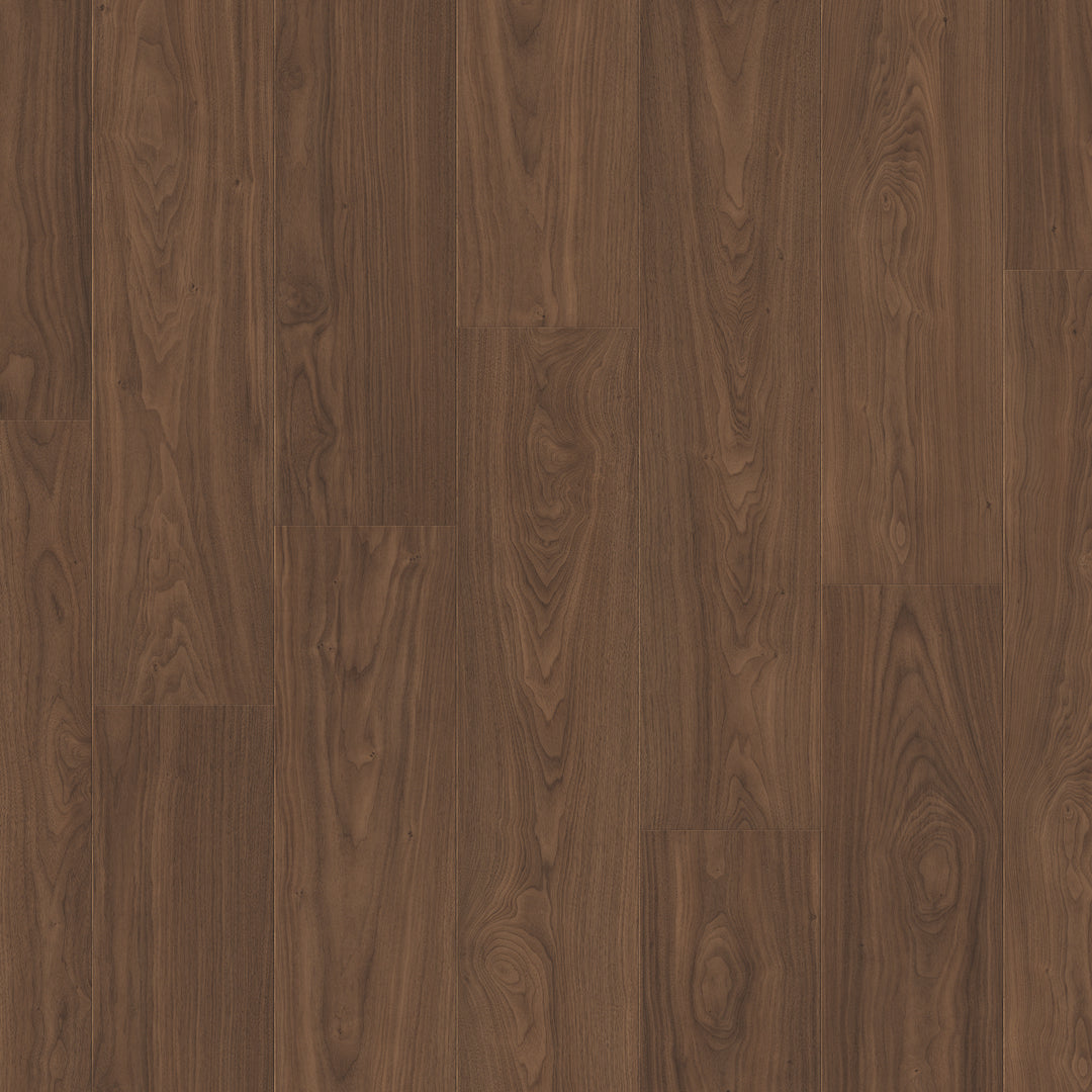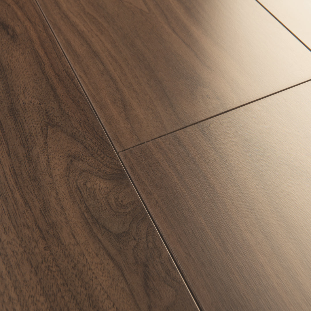 Quickstep laminate, wood texture, easy installation, durable, scratch resistant, underfloor heating compatible, walnut laminate flooring, realistic wood appearance, eco-friendly, classic walnut.